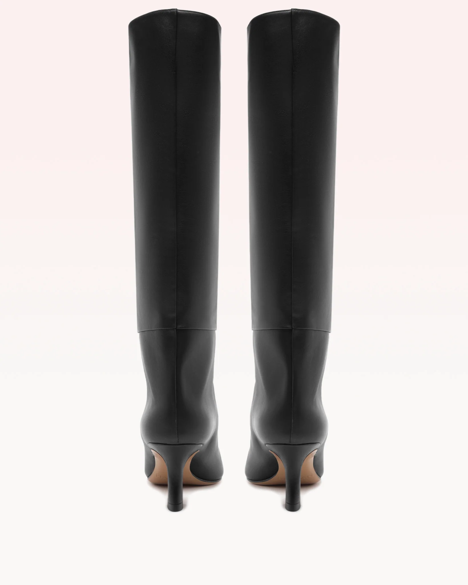 Brena 60 is a luxury black boot crafted in smooth vitello leather. This elegant boot features a pointed toe and sculptural geometric heel, combining timeless design with bold sophistication—perfect for elevating any day-to-night look.