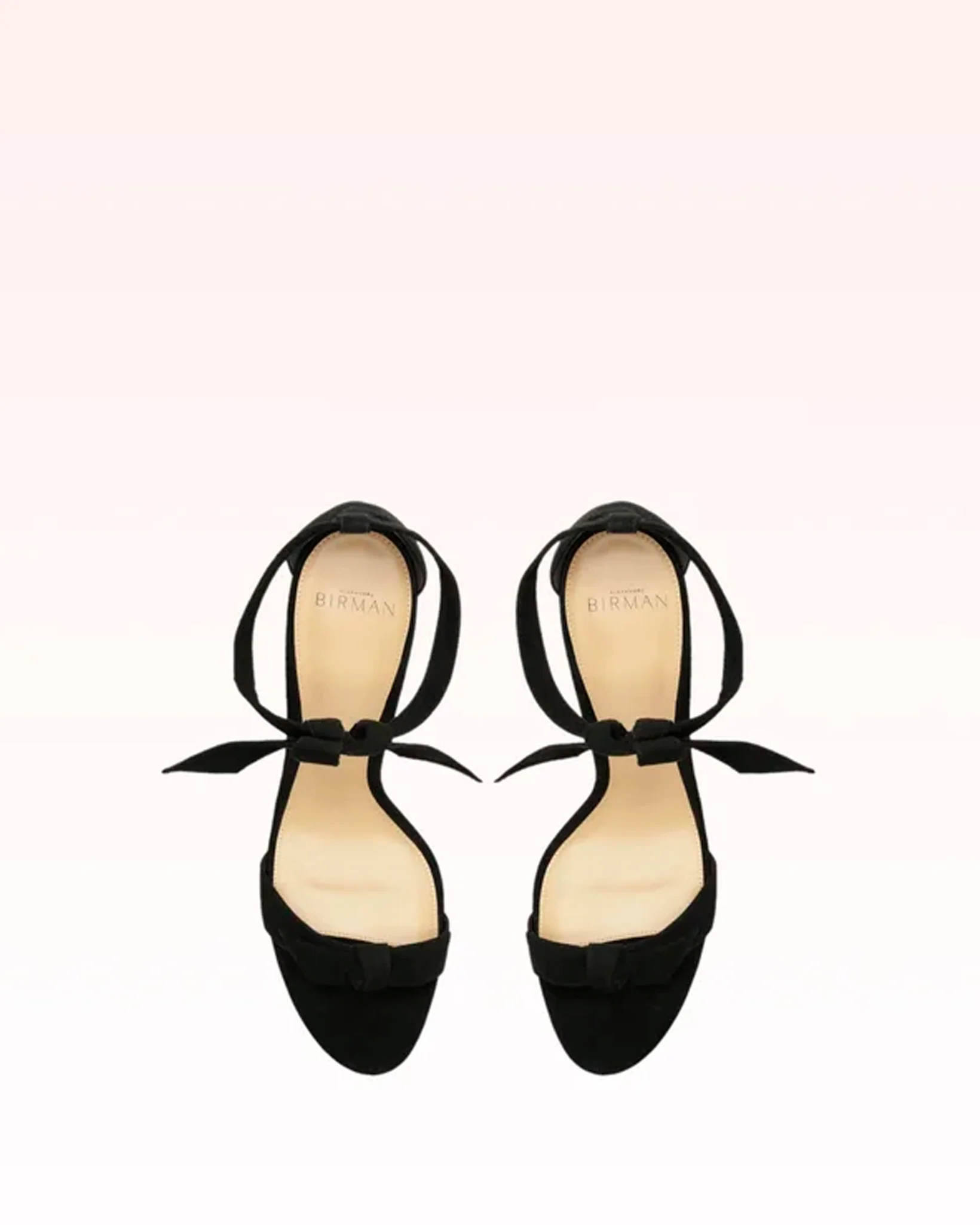 A 90mm block heel updates our timeless Clarita Sandal. Hand-crafted from supple suede, the elegant silhouette showcases two of our iconic bow embellishments. The versatile black hue will complement any look from day to night.