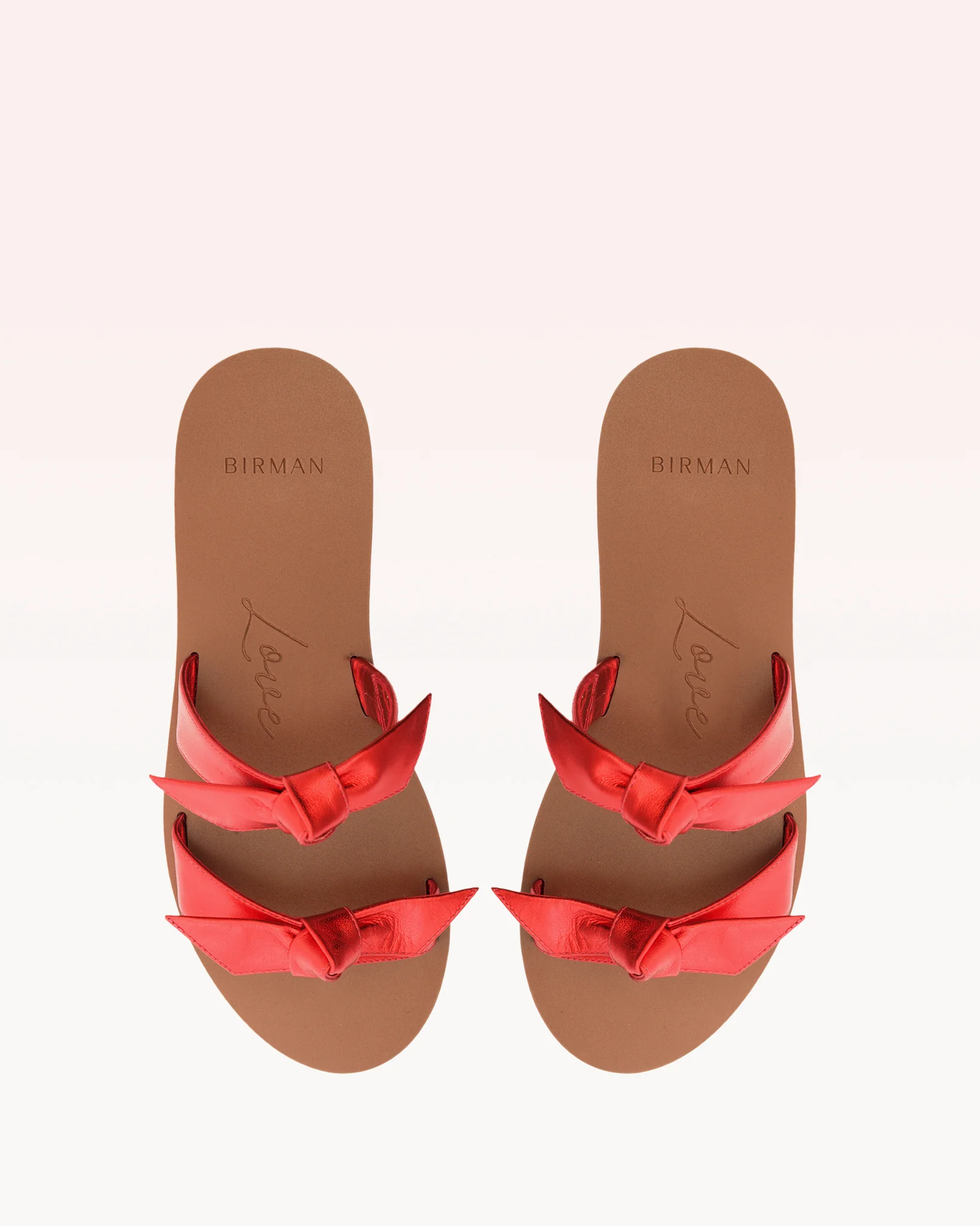 Indulge in luxury this holiday season with our Clarita Metallic Sandal. This sophisticated flat is crafted from premium metallic leather with a soft nappa leather lining, complete with our iconic signature bows. Elevate your look with this elegant and exclusive piece.