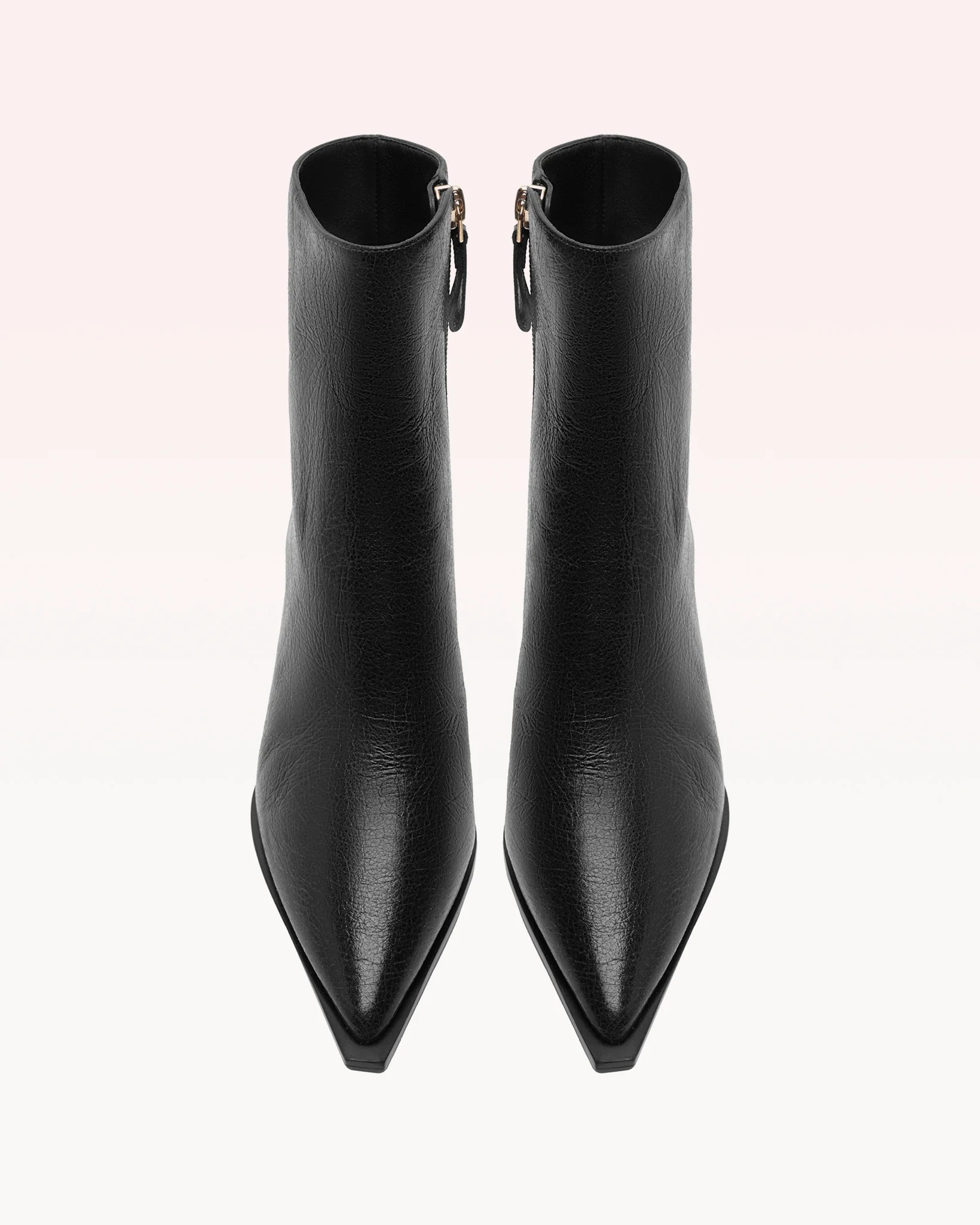 The classic minimalist boot silhouette is redefined in Calf Antique leather, featuring elegant details and a naturally aged finish. Enhanced by leather trim, the design exudes refinement and underscores the exclusivity of its craftsmanship. Accented with a pointed toe and a delicate kitten heel, it offers a sophisticated and polished look.