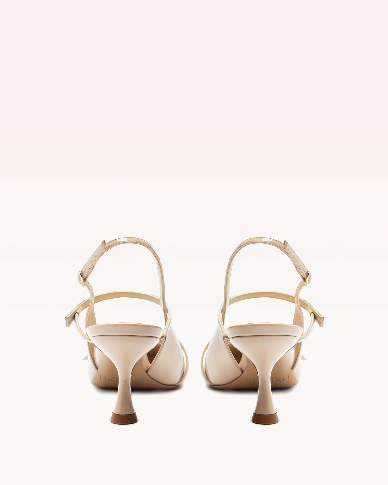Meet the ideal transitional Pump: a stunning slingback inspired by Alexandre Birman's Tita style. It's a graceful fusion, incorporating elements of the classic refinement found in the Clarita sandal. Crafted with leather strings reminiscent of the Clarita's shape, this slingback elegantly envelops the foot. The sharp and timeless silhouette of the pointed toes adds a touch of elegance to the overall design.