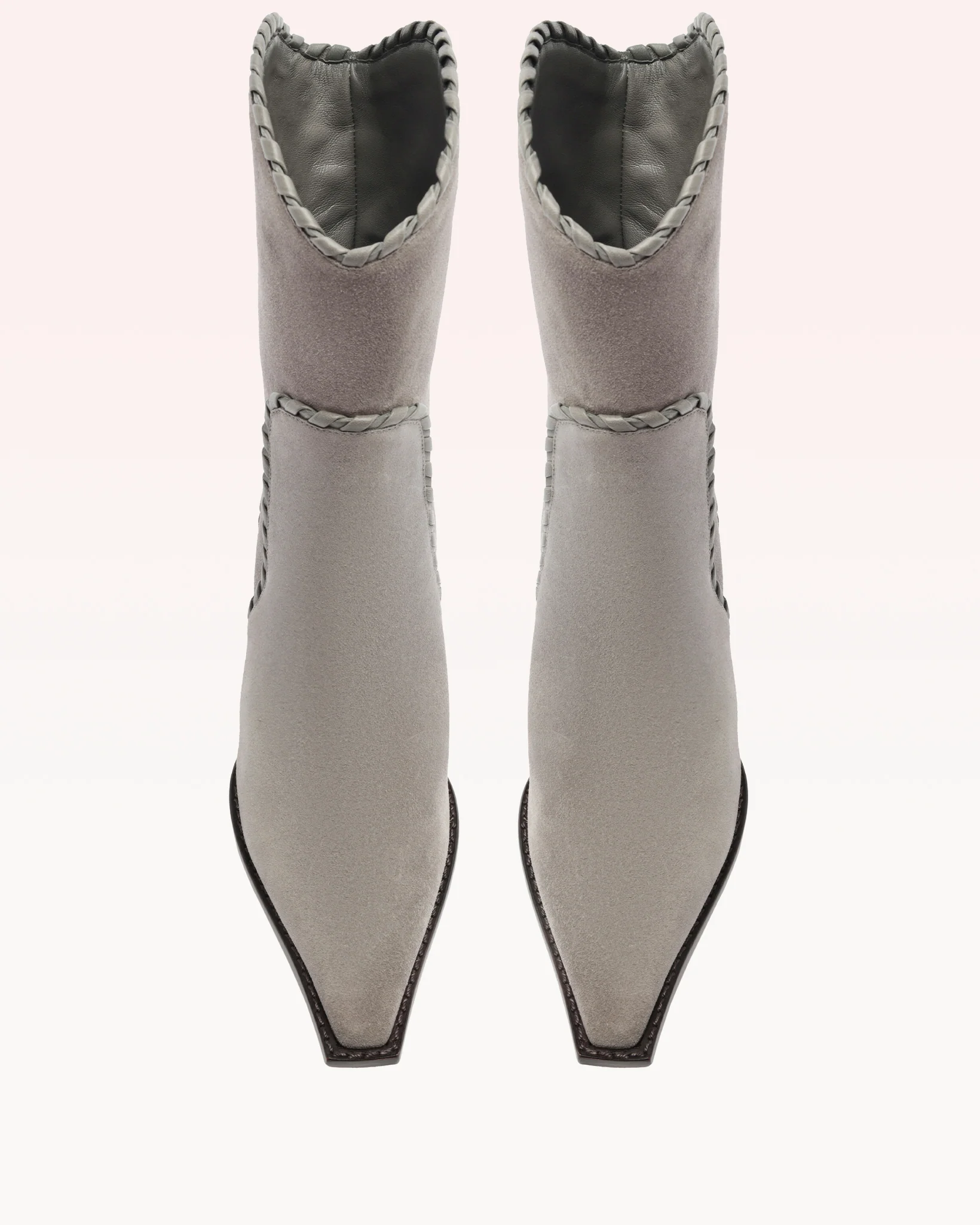 The scamosciato boot is reimagined in this collection. The upper showcases woven leather accents that frame the boot’s cutouts, lending a refined and elegant texture. A wooden block heel enhances the elongated square toe and structured silhouette, resulting in a chic and modern design. Perfect for those who desire a bold, contemporary aesthetic with distinctive, meticulously crafted details.